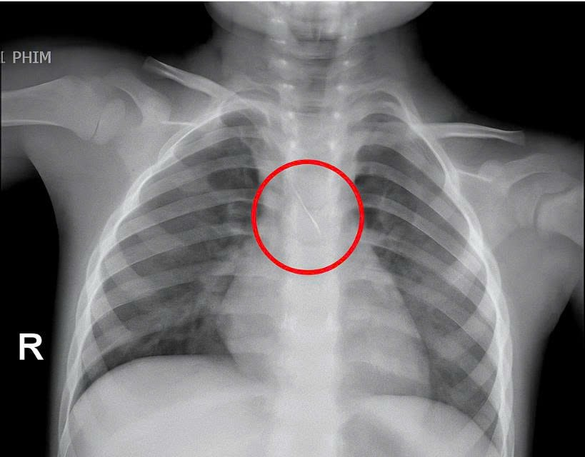 Theo gia đình, bé Đ. đang được làm răng thì kim chọc tủy bất ngờ rơi vào đường thở. Đây là tình huống hy hữu nếu không cấp cứu kịp thời có thể dẫn đến xẹp phổi, viêm phổi, tràn khí màng phổi hoặc tử vong.